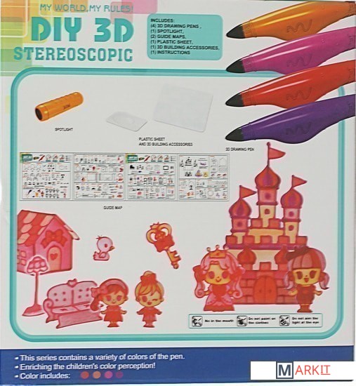 В набор входит 4 ручки.Ручка не требует электричества и нагрева. Объемные поделки создаются благодаря, взаимодействию жидкого полимера и ультрафиолетового свечения. Впоследствии любая созданная фигура приобретает твердую форму.