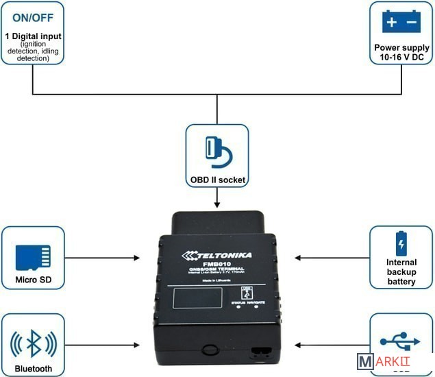 FMB010 — это легко монтируемый терминал для отслеживания транспортного средства в режиме реального времени с поддержкой GNSS, GSM и Bluetooth связи, который может собирать координаты и другие полезные данные и передавать их через сеть GSM на сервер. Это устройство идеально подходит для приложений, использующих данные о местонахождении удаленных объектов и может применяться в: управлении автопарком, компаниях по аренде автомобилей, службах такси, а также в личных автомобилях и т. д.