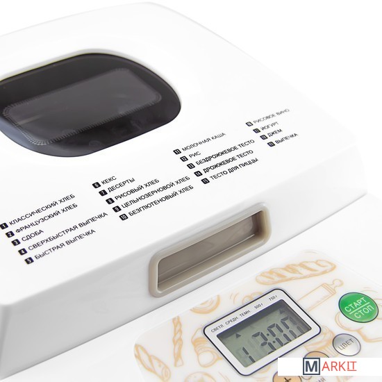| Перечень режимов работы | безглютеновая выпечкабездрожжевая выпечкавареньедесертная выпечкайогурткексфранцузский хлебцельнозерновой хлеб |