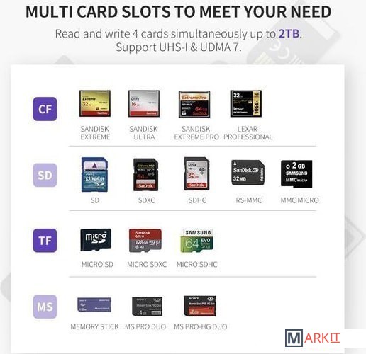 | Поддержка карт (без адаптера) | CompactFlash, SD, SDHC, SDXC, microSD, microSDHC, microSDXC, Memory Stick, Memory Stick Duo, Memory Stick PRO HG Duo, MMCmicro, RS-MMC |