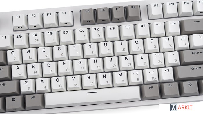 КЛАВИАТУРА БЕЗ КИРИЛЛИЦЫТип: кликающийСила нажатия: 60 грамм (несмотря на вес, средние)Длина пути: 4 мм (2.2 мм до срабатывания)Клавиатура поддерживает сочетания клавиш для регулировки громкости и управления музыкой. Также имеется возможность отключить кнопку Windows.Два кабеля в комплекте - Вы можете использовать как USB Type-C, так и старый добрый USB Type-A.Durgod Zeus Engine позволяет создавать макросы. Можно создать свои мультимедиа, функциональные макросы и многое другое. ПО не поддерживается на Mac OS.Канавки для укладки кабеля - Расположены с обратной стороны клавиатуры и позволяют выводить кабель в трёх направлениях — слева, справа и посередине.Двойные регулируемые ножки предоставляют целых три варианта угла наклона клавиатуры для более комфортной печати, а их прорезиненное дно не даст клавиатуре сдвинуться с места.Позволяет нажимать одновременно неограниченное количество клавиш. Для печати идеально подойдет как 6KRO, так и NKRO, независимо от вашей скорости. Для игр NKRO будет плюсом и неважно, нажимаете ли вы больше 6 кнопок или нет, поскольку, играя в любую игру, вы можете случайно нажать пару лишних клавиш и из-за этого клавиатура может не среагировать на нажатие, которые вы хотели совершить изначально. Осторожно, старые BIOS-ы могут не реагировать на клавиатуру из-за NKRO.
