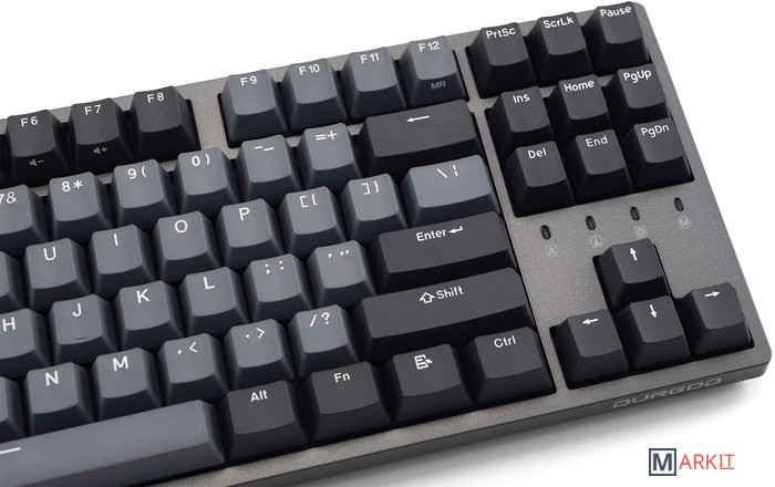 КЛАВИАТУРА БЕЗ КИРИЛЛИЦЫТип: кликающийСила нажатия: 60 грамм (несмотря на вес, средние)Длина пути: 4 мм (2.2 мм до срабатывания)Клавиатура поддерживает сочетания клавиш для регулировки громкости и управления музыкой. Также имеется возможность отключить кнопку Windows.Два кабеля в комплекте - Вы можете использовать как USB Type-C, так и старый добрый USB Type-A.Durgod Zeus Engine позволяет создавать макросы. Можно создать свои мультимедиа, функциональные макросы и многое другое. ПО не поддерживается на Mac OS.Канавки для укладки кабеля - Расположены с обратной стороны клавиатуры и позволяют выводить кабель в трёх направлениях — слева, справа и посередине.Двойные регулируемые ножки предоставляют целых три варианта угла наклона клавиатуры для более комфортной печати, а их прорезиненное дно не даст клавиатуре сдвинуться с места.Позволяет нажимать одновременно неограниченное количество клавиш. Для печати идеально подойдет как 6KRO, так и NKRO, независимо от вашей скорости. Для игр NKRO будет плюсом и неважно, нажимаете ли вы больше 6 кнопок или нет, поскольку, играя в любую игру, вы можете случайно нажать пару лишних клавиш и из-за этого клавиатура может не среагировать на нажатие, которые вы хотели совершить изначально. Осторожно, старые BIOS-ы могут не реагировать на клавиатуру из-за NKRO.