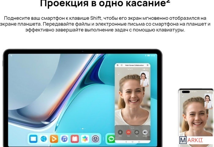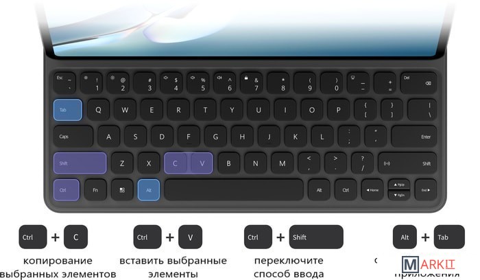 Повысьте свою эффективность с помощью клавиатуры HUAWEI Smart Magnetic Keyboard. Прикрепите к планшету магнитную клавиатуру, и она автоматически подключится к планшету и начнет заряжаться. Благодаря технологии магнитной индукции планшет автоматически выходит из спящего режима, когда открывается чехол-клавиатура, и входит в спящий режим, когда чехол закрывается.Легкий и прочный чехол с клавиатурой защищает планшет в любых условиях и обеспечивает низкий уровень износа. Два варианта угла наклона позволяют вам комфортно смотреть фильмы и просматривать веб-страницы.Клавиатура создана для максимально комфортного ввода текста. Длина хода клавиш составляет 1,3 мм, обеспечивая тактильный отклик во время печати, что позволяет более точно вводить текст.Используйте функции быстрого доступа на клавиатуре, чтобы сэкономить время. Доступно более 40 комбинаций функций программного обеспечения и операционной системы, что позволит вам быстрее и легче справляться с редактированием файлов, графическими и другими задачами.Поднесите ваш смартфон к клавише Shift, чтобы его экран мгновенно отобразился на экране планшета. Передавайте файлы и электронные письма со смартфона на планшет и эффективно завершайте выполнение задач с помощью клавиатуры.