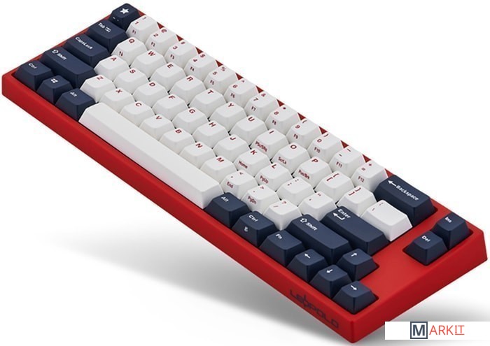 КЛАВИАТУРА БЕЗ КИРИЛЛИЦЫТип: линейныйСила нажатия: 60 грамм (тяжелые)Длина пути: 4 мм (2 мм до срабатывания)Данная модель имеет красно-белую расцветку с тёмно-синими клавишами-модификаторами — очень смелое и яркое цветовое решение. Собрана клавиатура добротно и монолитно, а сочетание высококачественных double-shot PBT клавиш с переключателями Cherry MX и звукопоглощающей подложки позволяет сделать печать на клавиатуре максимально тихой (насколько это возможно для механики). Mini-USB порт вынесен на верхний правый торец клавиатуры, поэтому если вы часто носите клавиатуру с собой, подключение и отключение клавиатуры будет мгновенным и без лишней возни.За счет использования FN-слоя клавиатура имеет аналогичную полноразмерным клавиатурам функциональность при своем компактном размере.DIP-переключатели на задней панелиДают возможность поменять местами функции кнопок Ctrl и Caps Lock, Windows и Alt, Windows и Fn или отключить Windows.Звукопоглощающая подложкаПоглощает звуки при нажатии, делая процесс печати более тихим по сравнению с обычными механическими клавиатурами.Низкопрофильные клавиши Step-Sculpture2Данные клавиши заметно ниже и имеют оптимальный угол наклона, из-за чего, по отзывам, печатать приятнее и комфортнее, чем на более высоких клавишах.Функция Full N-key Rollover по PS/2 (NKRO)Стандартное подключение через USB позволяет одновременно нажимать до 6 клавиш (6KRO), этого хватит любому обычному человеку независимо от его скорости печати.Подключение через PS/2 разрешает одновременно нажимать любое количество клавиш (NKRO) — пригодится геймерам, которым нужно часто прожимать более 6 клавиш почти моментально.