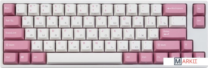 КЛАВИАТУРА БЕЗ КИРИЛЛИЦЫТип: линейныйСила нажатия: 45 грамм (легкие)Длина пути: 4 мм (2 мм до срабатывания)Данная модель имеет няшную бело-розовую расцветку, прямо как у Hello Kitty. Собрана клавиатура добротно и монолитно, а сочетание высококачественных double-shot PBT клавиш с переключателями Cherry MX и звукопоглощающей подложки позволяет сделать печать на клавиатуре максимально тихой (насколько это возможно для механики). Mini-USB порт вынесен на верхний правый торец клавиатуры, поэтому если вы часто носите клавиатуру с собой, подключение и отключение клавиатуры будет мгновенным и без лишней возни.За счет использования FN-слоя клавиатура имеет аналогичную полноразмерным клавиатурам функциональность при своем компактном размере.DIP-переключатели на задней панелиДают возможность поменять местами функции кнопок Ctrl и Caps Lock, Windows и Alt, Windows и Fn или отключить Windows.Звукопоглощающая подложкаПоглощает звуки при нажатии, делая процесс печати более тихим по сравнению с обычными механическими клавиатурами.Низкопрофильные клавиши Step-Sculpture2Данные клавиши заметно ниже и имеют оптимальный угол наклона, из-за чего, по отзывам, печатать приятнее и комфортнее, чем на более высоких клавишах.Функция Full N-key Rollover по PS/2 (NKRO)Стандартное подключение через USB позволяет одновременно нажимать до 6 клавиш (6KRO), этого хватит любому обычному человеку независимо от его скорости печати.Подключение через PS/2 разрешает одновременно нажимать любое количество клавиш (NKRO) — пригодится геймерам, которым нужно часто прожимать более 6 клавиш почти моментально.
