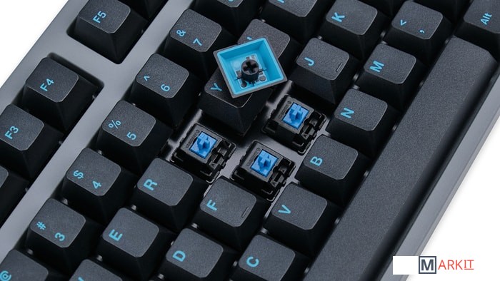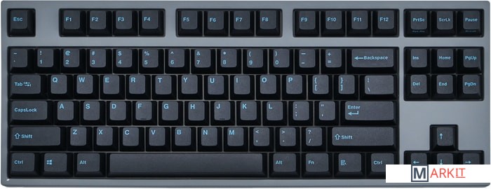 КЛАВИАТУРА БЕЗ КИРИЛЛИЦЫТип: тактильный Сила нажатия: 55 грамм (средние)Длина пути: 4 мм (2 мм до срабатывания)Данная модель имеет темную цветовую схему, расцветка обязательно понравится фанатам классики. Клавиатура собрана добротно и монолитно, а сочетание высококачественных double-shot PBT клавиш с переключателями Cherry MX и звукопоглощающей подложкой позволяет сделать печать на клавиатуре максимально тихой (насколько это возможно для механики). Mini-USB порт спрятан в центре под корпусом, а на самой клавиатуре имеются центральная и две боковые канавки под кабель.Клавиатура поддерживает сочетание клавиш для регулировки громкости и управления музыкой, также имеется возможность переключения между 6KRO и NKRO.DIP-переключатели на задней панелиДают возможность поменять местами функции кнопок Ctrl и Caps Lock, Windows и Alt, Windows и Fn или отключить Windows.Звукопоглощающая подложкаПоглощает звуки при нажатии, делая процесс печати более тихим по сравнению с обычными механическими клавиатурами.Низкопрофильные клавиши Step-Sculpture2Данные клавиши заметно ниже и имеют оптимальный угол наклона, из-за чего, по отзывам, печатать приятнее и комфортнее, чем на более высоких клавишах.Клавиатура совместима с Mac OSFN-слой работает (кроме клавиш F6, F8, F9), а поменять местами клавиши-модификаторы можно в системных настройках. Проверено с MAC OS 10.13Функция Full N-key Rollover по USB (NKRO)Позволяет нажимать одновременно неограниченное количество клавиш. Для печати идеально подойдет как 6KRO, так и NKRO, независимо от вашей скорости. Для игр NKRO будет плюсом и неважно, нажимаете ли вы больше 6 кнопок или нет, поскольку, играя в любую игру, вы можете случайно нажать пару лишних клавиш и из-за этого клавиатура имеет шанс не среагировать на нажатие, которое вы хотели совершить изначально. Имеется возможность переключения между NKRO и 6KRO через FN сочетания.