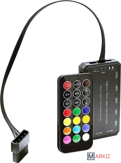 Контроллер управления RGB вентиляторами корпуса с ДУ пультом управления. Возможность подключения до 10 вентиляторов RGB и до двух линий RGB. До 200 встроенных различных режимов подсветки. Регулировка скорости вращения вентиляторов с пульта (3 режима).