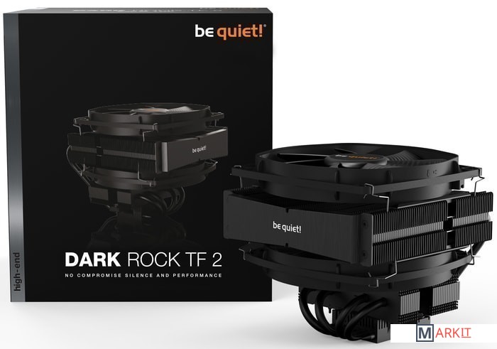 Dark Rock TF 2 оснащен шестью высокопроизводительными медными тепловыми трубками, которые оптимально распределяют тепло на пластины радиатора. Специальное черное покрытие с керамическими частицами обеспечивает идеальную передачу тепла.Конструкция Dark Rock TF 2 с двумя алюминиевыми радиаторами обеспечивает внушительное пространство для установки модулей RAM высотой до 49мм. Кулер укомплектован двумя вентиляторами, но также возможно использование лишь одного вентилятора для дополнительной экономии пространства и еще более тихой работы.