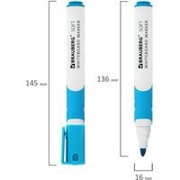 Высококачественный маркер BRAUBERG «SOFT» для белой доски. Предназначен для письма на досках с магнитно-маркерной поверхностью.Маркер для доски светло-голубого цвета обладает круглым пластиковым корпусом диаметром 16 мм. Корпус оснащен удобной прорезиненной зоной захвата для более удобного использования. Наконечник круглой формы обеспечивает толщину линии письма 5 мм, что позволяет писать крупным шрифтом, который будет хорошо виден. Основа чернил — спиртовая. Чернила быстро высыхают и не оставляют разводов, легко стираются сухой губкой. Изделие не перезаправляется. Цвет колпачка и прорезиненной вставки соответствует цвету чернил.
