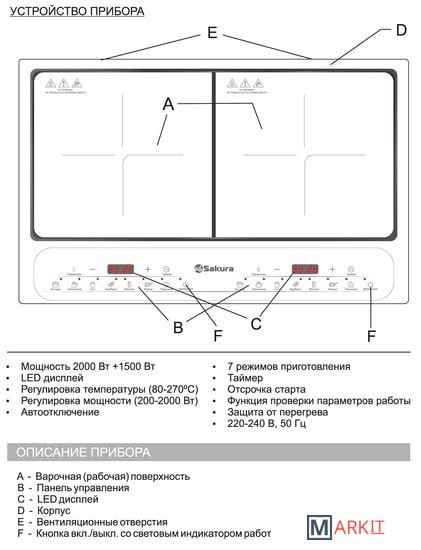 Макс.нагрузка: не более 8 кг на каждую конфорку;Регулировка температуры: 80-270 °C;Отсрочка старта: 24 ч;Длина сетевого кабеля: 1.5 м.