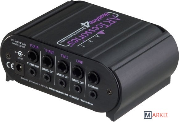 Студийный четырехканальный усилитель для наушников. Предназначен для одновременного усиления 4 пар наушников. Стоит отметить что все выходы для наушников являются дублирующими, другими словами использовать одновременно можно только 4 выхода из 8. Каждый из выходов оснащен индивидуальным регулятором громкости. Работает как в стерео так и в моно режиме.