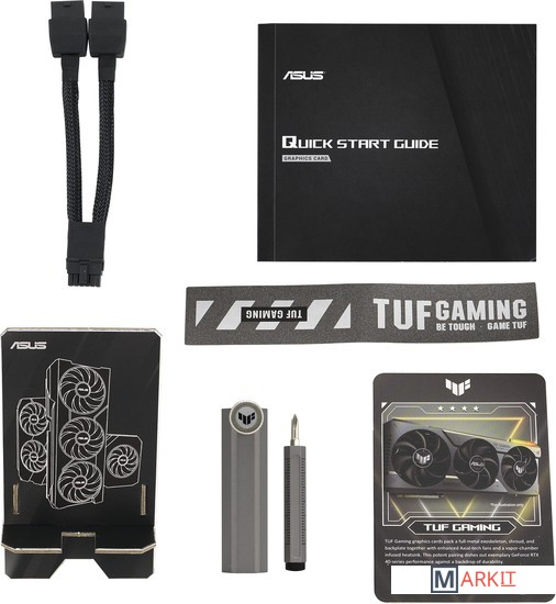 Комплект поставки 1 коллекционная карточка1 инструкция по быстрой установке1 кабель 16pin - 2x 8pin1 держатель видеокарты TUF1 липучка Velcro TUF1 благодарственная карточка1 сертификат TUF Gaming